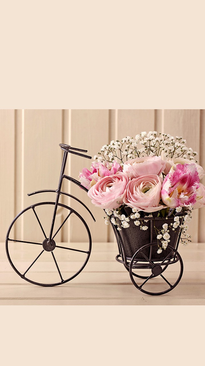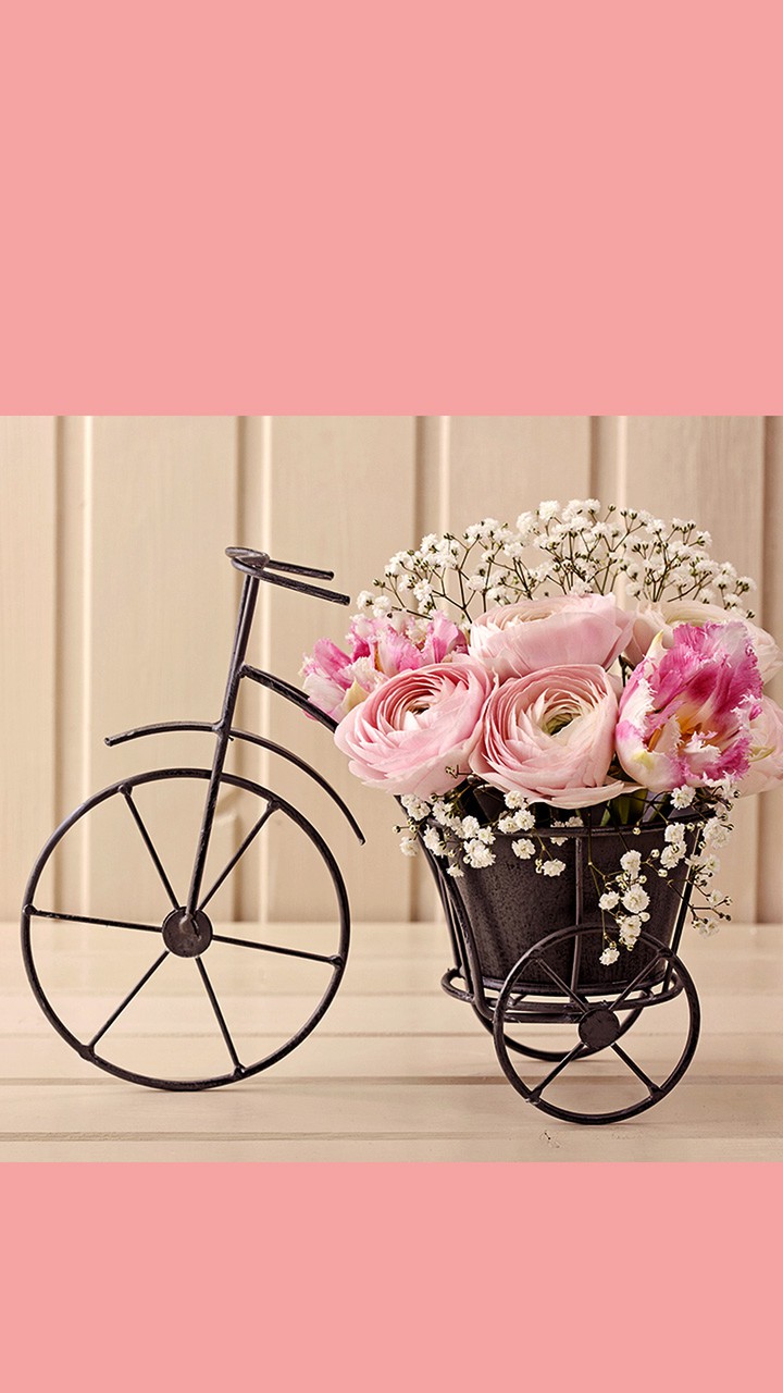 ブリキの自転車とピンクのお花のロマンチックなテーマ。