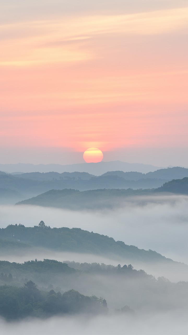 壮大な山々を覆う海雲と朝日の美しいテーマ